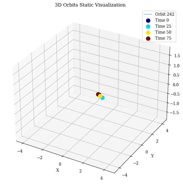 visualize_static_orbits(orbit_data, time_instants=[0, 25, 50, 75], orbit_indices=[random_orbit_index])